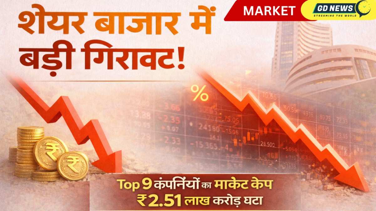 📉 सेन्सेक्स पर सूचीबद्ध टॉप 10 कंपनियों में से 9 कंपनियों का कुल मार्केट कैप लगभग ₹2.51 लाख करोड़ कम हुआ।